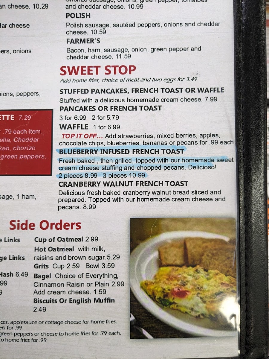 What stands out right away is the variety. You can go light with a simple salad or dive into a plate of biscuits and gravy that doesn’t hold back. There’s something satisfying about seeing classic diner favorites share space with homestyle dinners and generous portions that promise leftovers. It’s the kind of menu you scan slowly because everything sounds familiar, filling, and exactly what you’re craving today.